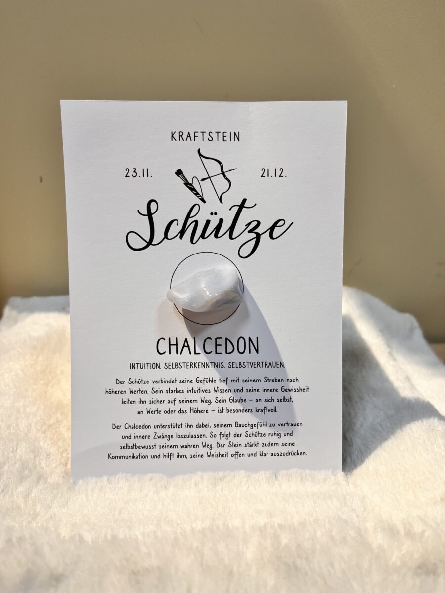 Diese wunderschöne Geschenkkarte ist mit dem Kraftstein „Chalcedon“ versehen – dem Edelstein des Sternzeichens Schütze. Er symbolisiert Intuition, Selbsterkenntnis und Selbstvertrauen.