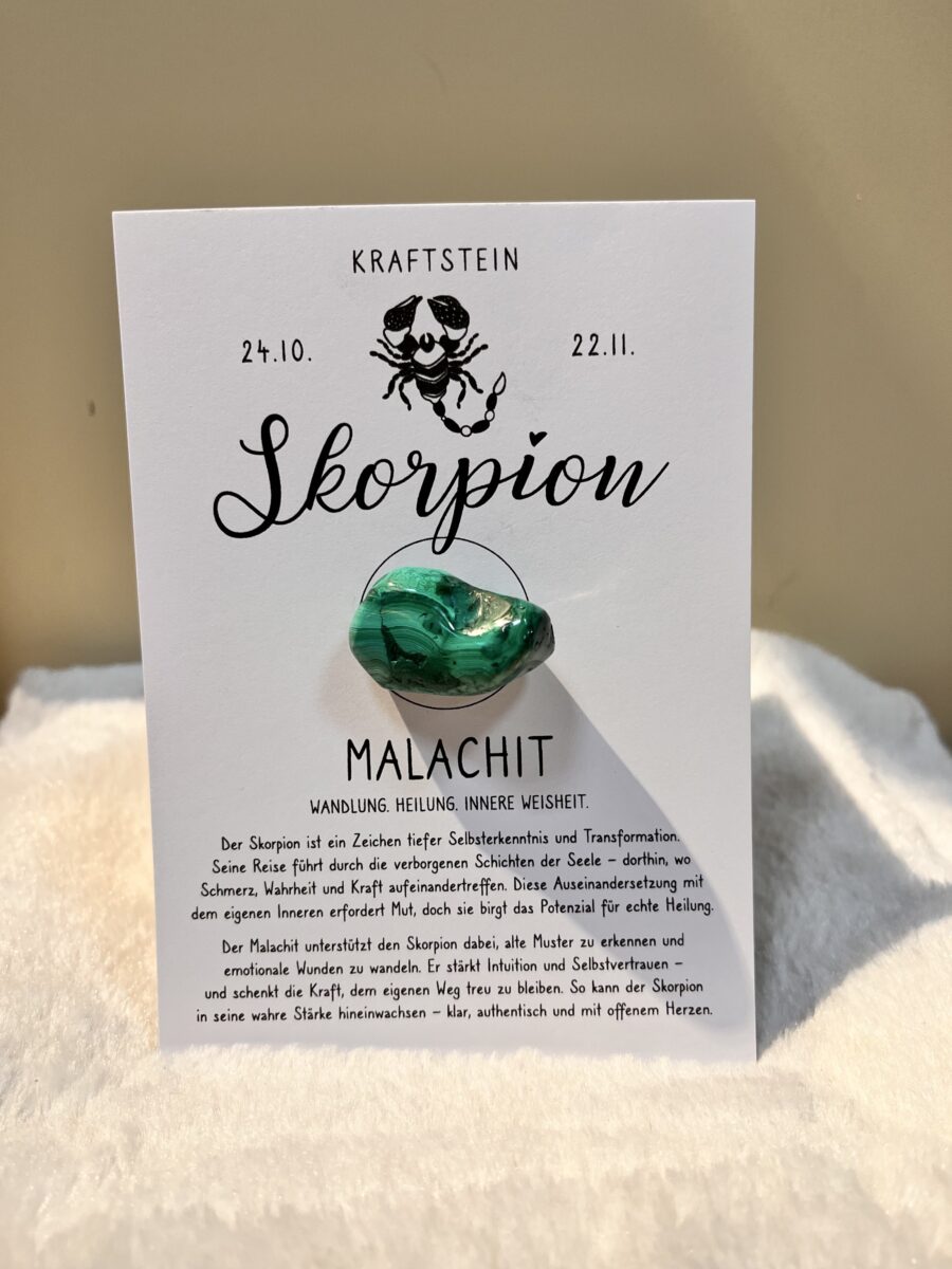 Diese wunderschöne Geschenkkarte ist mit dem Kraftstein „Malachit“ versehen – dem Edelstein des Sternzeichens Skorpion. Er symbolisiert Wandlung, Heilung und innere Weisheit.