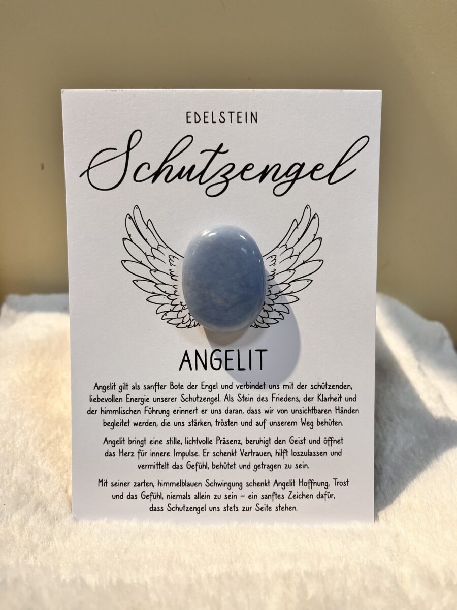 Diese liebevoll gestaltete Karte mit dem Edelstein Angelit, dem Schutzengel-Stein, wurde mit viel Sorgfalt und Herz gemacht. Sie steht für Schutz, Geborgenheit und das beruhigende Gefühl, behütet zu sein.