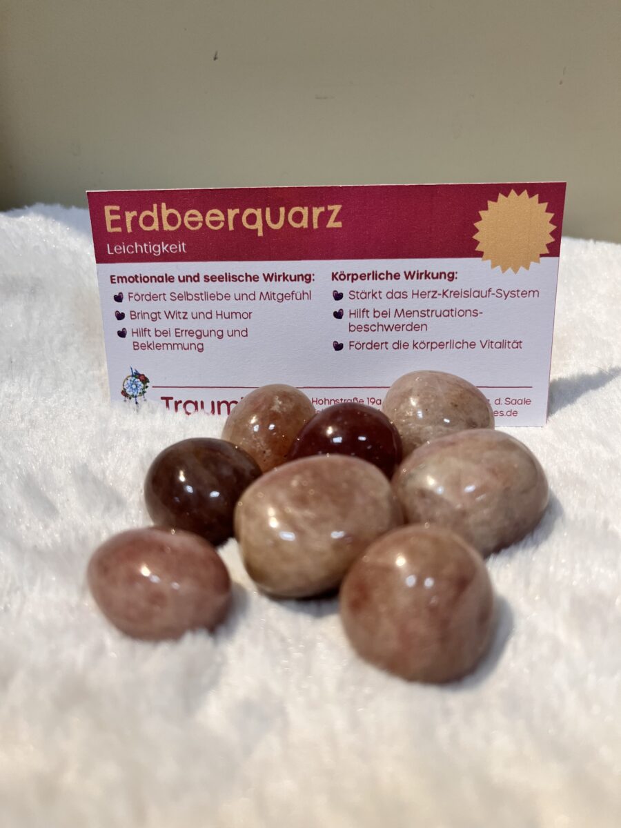 Dem Erdbeerquarz wird eine sanfte, herzöffnende Wirkung zugeschrieben. Auf emotionaler und seelischer Ebene soll er Selbstliebe und Mitgefühl fördern, Leichtigkeit ins Leben bringen und dabei helfen, wieder mehr Witz und Humor zuzulassen. Zudem gilt er als unterstützend bei innere Erregung und Beklemmung und kann helfen, emotionale Spannungen zu lösen.