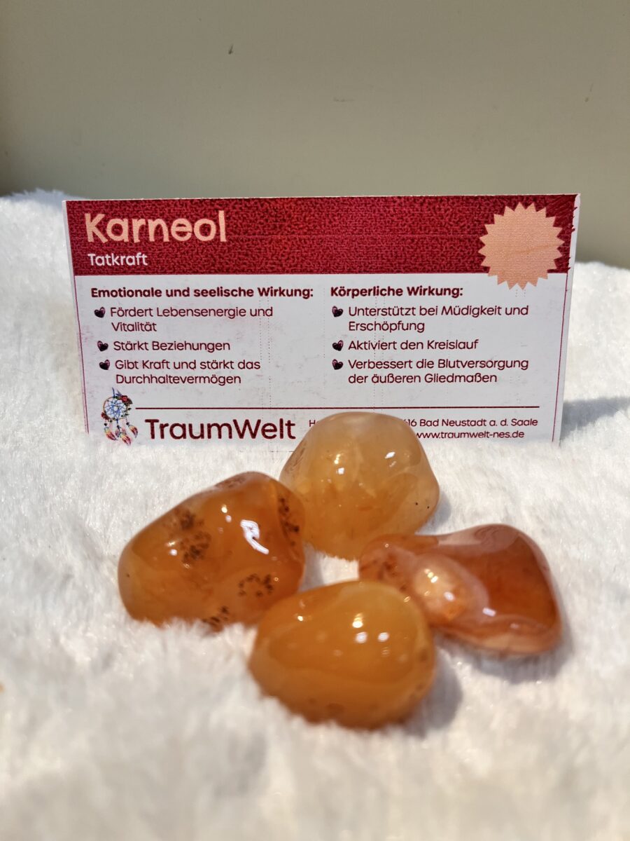 Karneol wird traditionell als Stein der Tatkraft und Lebensfreude geschätzt. Auf emotionaler und seelischer Ebene soll er die Lebensenergie und Vitalität fördern, Beziehugen stärken und dabei helfen, innere Stärke sowie Durchhaltevermögen zu entwickeln. Er gilt als unterstützender Begleiter, wenn es darum geht, neue Motivation zu finden und aktiv ins Handeln zu kommen.