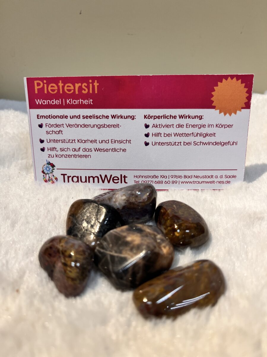 Der Pietersit begleitet Zeiten des Umbruchs und unterstützt dabei, Veränderungen offen und mutig anzunehmen. Er fördert Klarheit, Einsicht und hilft, den Blick auf das Wasentliche zu richten. Seine Energie unterstützt dabei, innere Ordnung zu schaffen und geistige Prozesse zu fokussieren – besonders dann, wenn vieles im Wandel ist.
